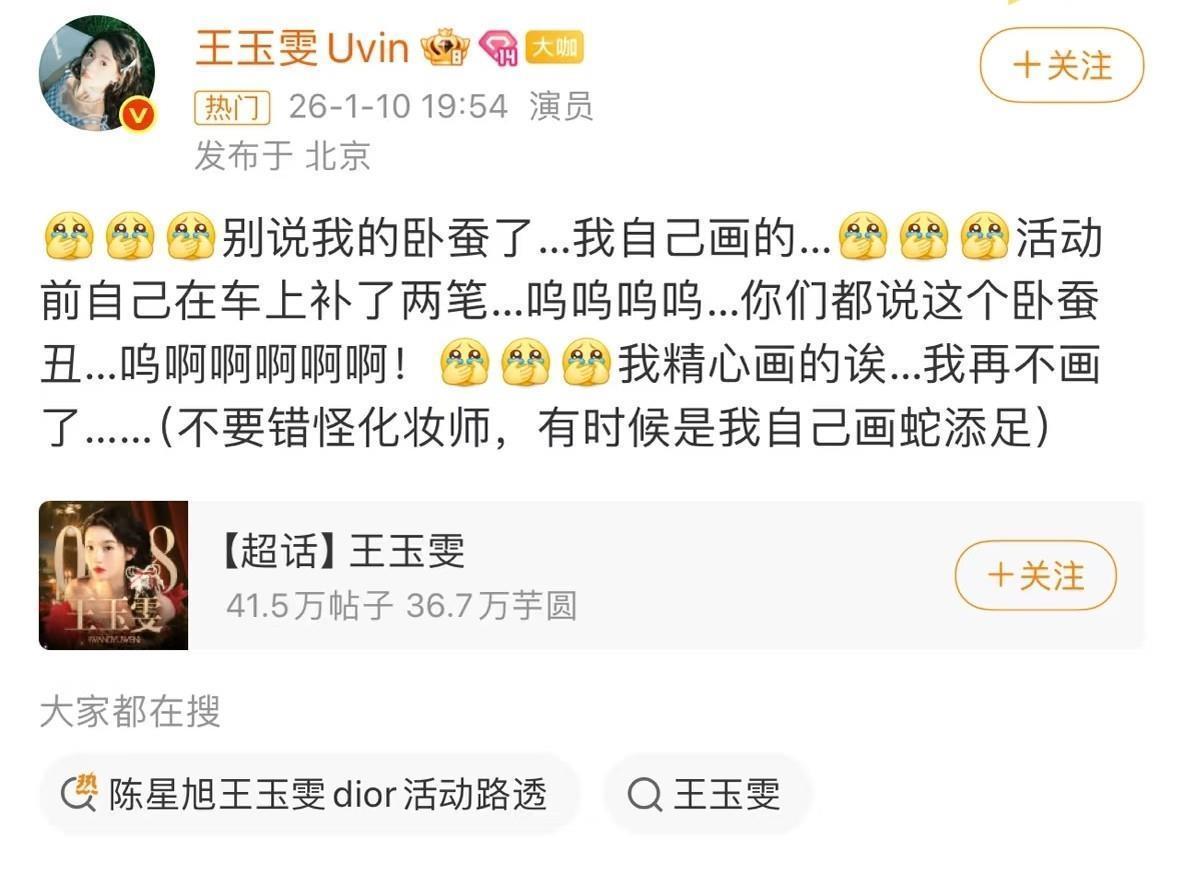 更没想到的是,她本人其实亲自参与了当天的补妆。原来那套妆容并不是完全由化妆师完成的,而是在去活动的路上,她在车上自己随手加了两笔——重点就是那对惹争议的卧蚕。她本以为是点睛之笔,结果成了众矢之的。